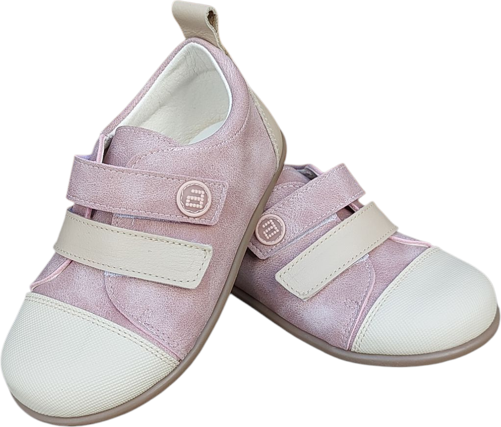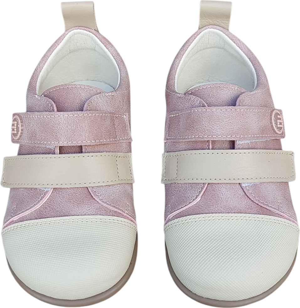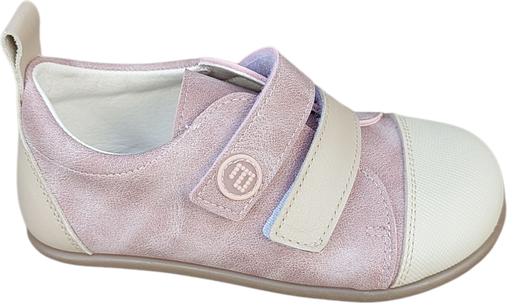 Estos zapatos respetuosos con 0 Drop en color rosa con puntera reforzada y uno de los dos velcros en color beig están diseñadas pensando en el bienestar y el desarrollo natural de los pies.